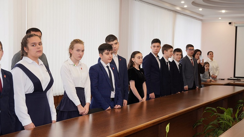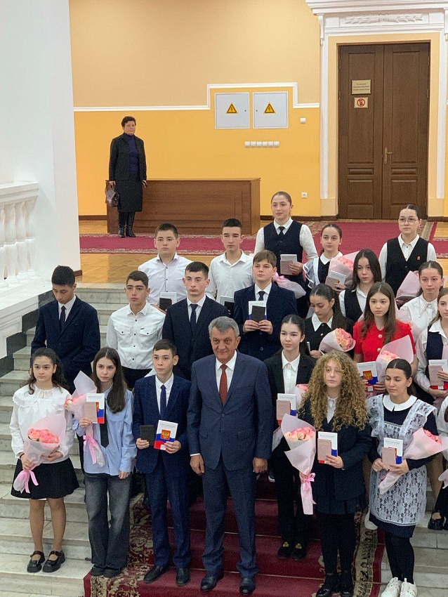 В рамках Всероссийского проекта «Движение Первых», приуроченный ко Дню Конституции 12 декабря 2025 года глава республики РСО-Алания Сергей Иванович Меняйло, мэр г. Владикавказ Вячеслав Эльбрусович Мильдзихов, председатель регионального отделения Российского движения детей и молодёжи «Движение Первых» в РСО-Алания Сармат Хасанбекович Шавлохов, заместитель главы администрации г.Владикавказ Мадина Тамерлановна Ходова, начальник отдела контроля и надзора в сфере образования Министерства образования и науки РСО-Алания Аслан Ермакович Батыров, в торжественной обстановке вручали паспорта лучшим ученикам города. Среди них оказались и наши дети, ученики МБОУ гимназии №45 им. Жоржа Дюмезиля Гергаулов Максим -8а класс, Гаина Дарья-8а класс, Кафланов Азим-8а класс, Лесь Злата 8а класс.