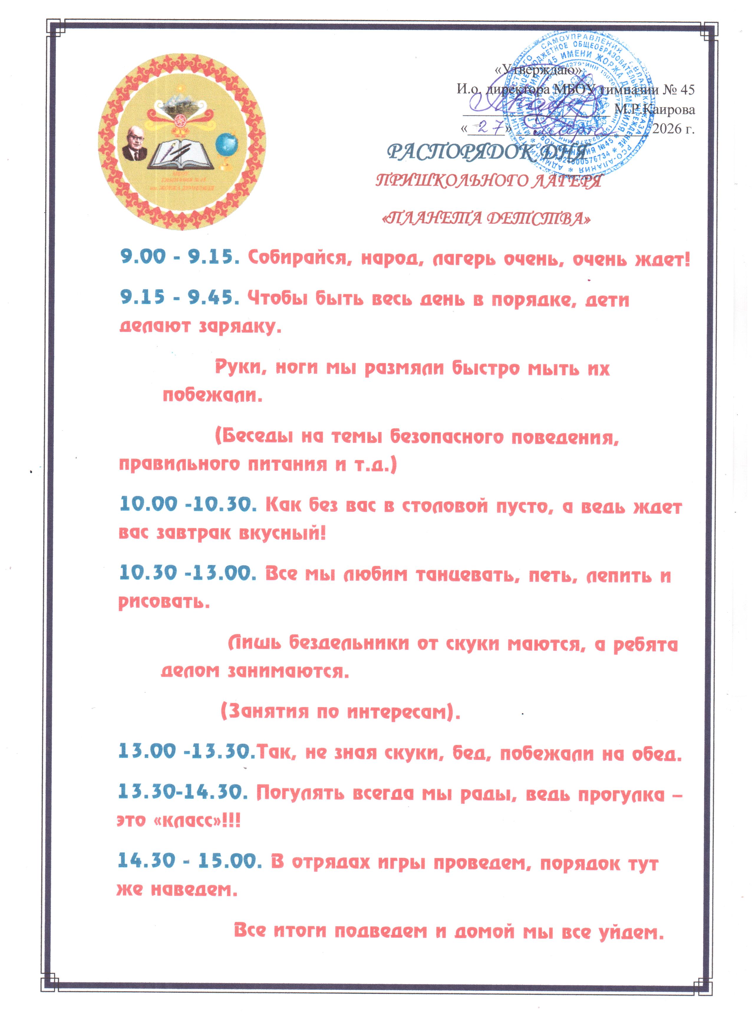 Распорядок дня пришкольного лагеря 45 Планета Детства-2026